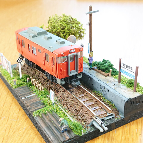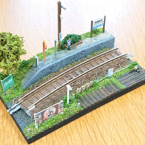 バラストやカラーパウダーを撒いたり、そして鉄道施設ストラクチャー(沿線看板や柵など)や列車を待つ人などの小物も取り付けて「ローカル無人駅の鉄道ジオラマ」を完成させましょう~♪