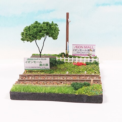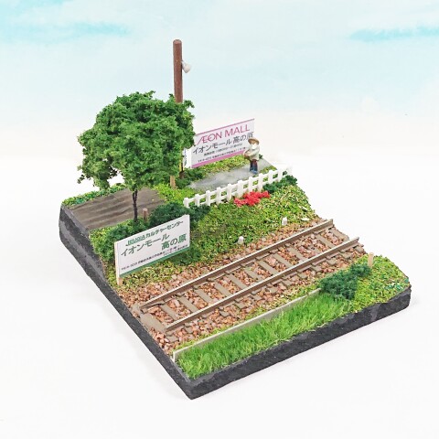 (沿線看板や柵など)や樹木などの小物も取り付けて「鉄道ジオラマ」を