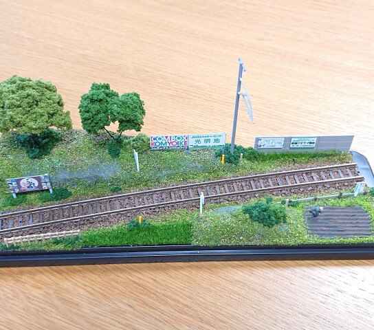 バラストやカラーパウダーを撒いたり、鉄道施設ストラクチャー(架線柱や沿線看板など)や樹木、農作業をしている人などの小物も設置して鉄道ジオラマを完成させましょう~♪