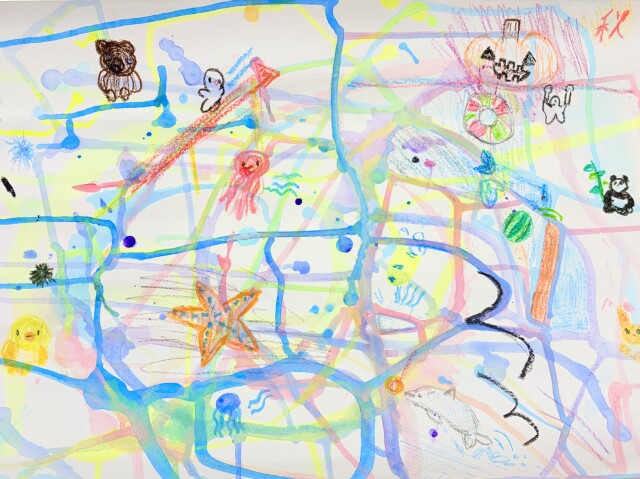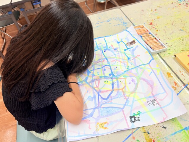 抽象的な表現や偶然から生まれる発想を大切にし、子どもらしい作品をのびのび生み出すことを目指しています。