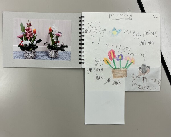 教室でスケッチブックに作品の絵やお花の名前を書き込み、ご自宅では写真を貼って仕上げておられます。そうしてできた一冊は、世界でたった一つの大切な宝物です。