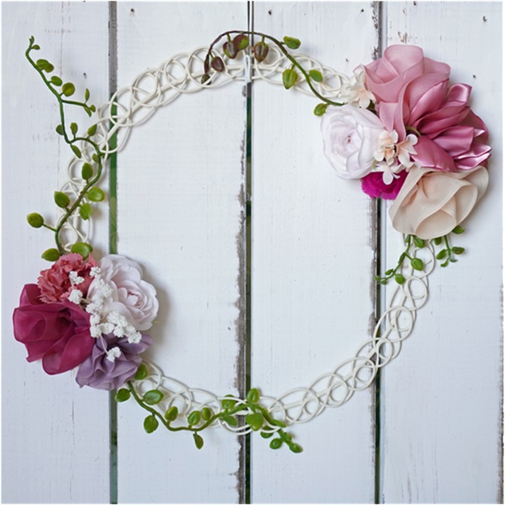 ライトピンクやワインなど色とりどりの花でリース(直径23㎝)を作ります。