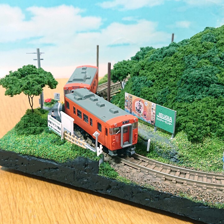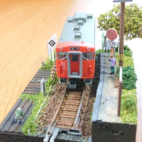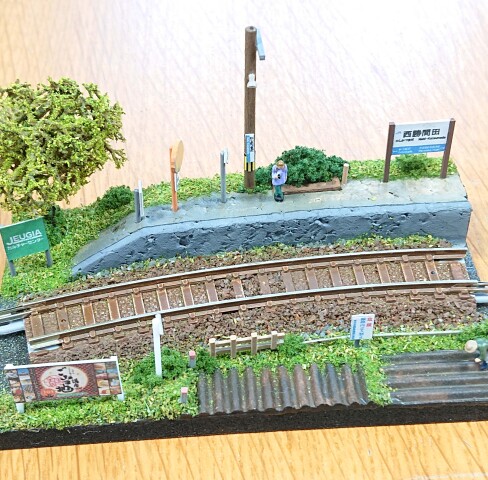 バラストやカラーパウダーを撒いたり、鉄道施設ストラクチャー(駅名標や沿線看板など)や樹木、無人駅で列車を待つ人などの小物も取り付けて「鉄道ジオラマ」を完成させましょう~♪