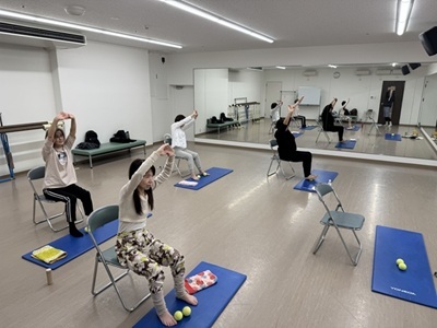 ご自身の身体に合わせて無理のないストレッチをしています。まずは姿勢をきれいにすることを目指して、自然と体幹を使って楽しくアンチエイジング運動をしましょう。