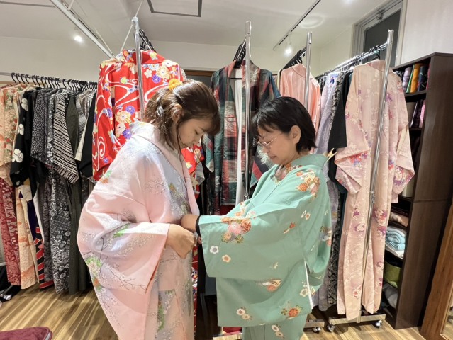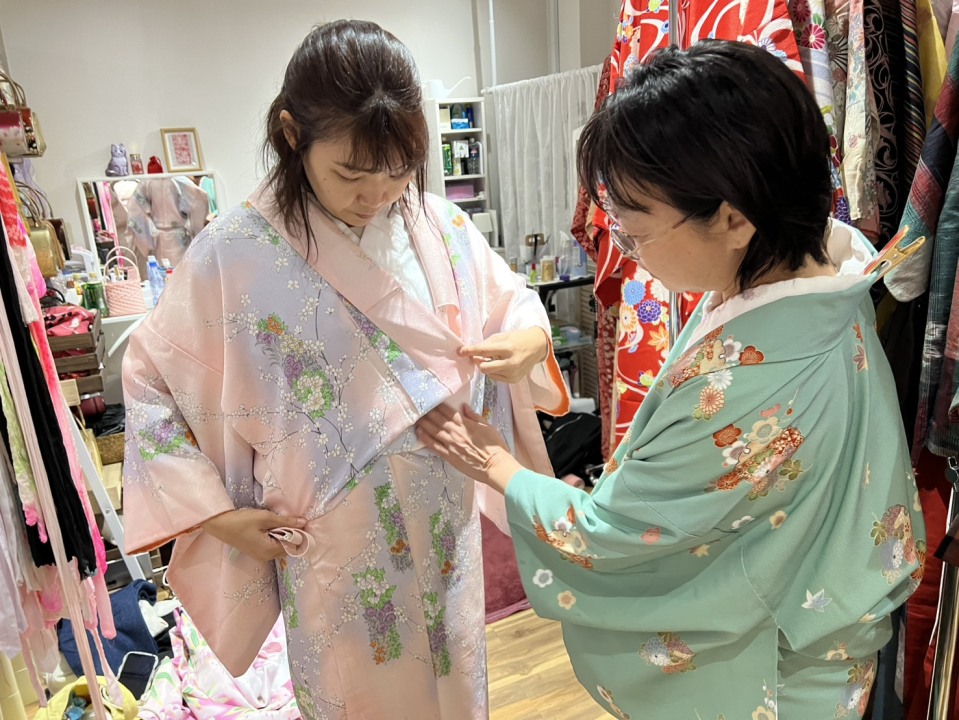 お洋服の上から着物を着ていただき、着付けの雰囲気を知っていただきたいと思います。