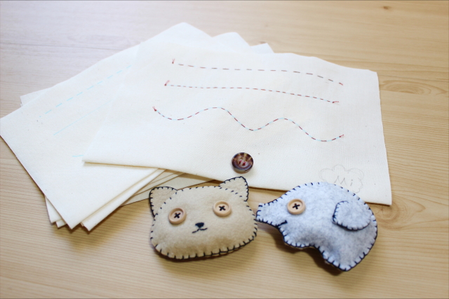 波縫いの練習やボタンのつけ方を学びながら、最後にフェルトのマスコットを完成させます。