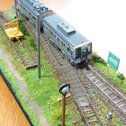 バラストやカラーパウダーを撒いたり、鉄道施設ストラクチャー(架線柱や沿線看板など)や樹木などの小物も設置をして「鉄道ジオラマ」を完成させましょう~♪