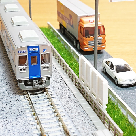 KATO製の複線レールの両側にバラストを撒いたり、泉北1号線の道路の一部を作ったり、そして鉄道施設ストラクチャー(架線柱や沿線看板など)や車などの小物も設置して「鉄道ジオラマ」を完成させましょう~♪
