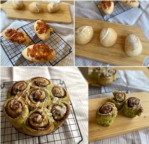 抹茶味の生地でこし餡をくるくる巻いて、型に入れて焼くあんパンです。成形も楽しい米粉で作るおやつパンです。初めての方にも作りやすい内容となってます。