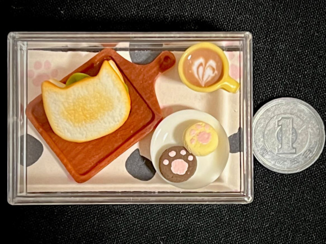本物そっくりでいて手のひらサイズの朝食セットは、にゃんカル参加のまめちゅあ先生のオリジナル作品!61×43×H18(㎝)の透明ケース付き