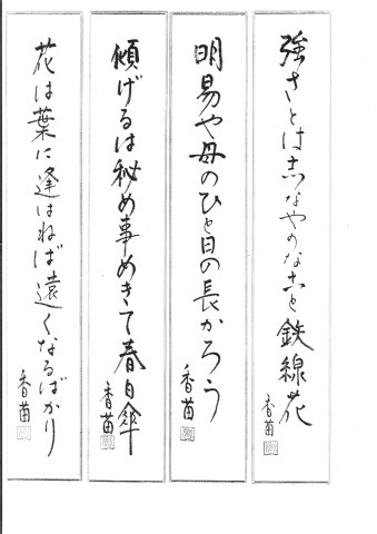 「初心者の方へ」の教室の設定ですので先ず教室は明るく解り易い授業を心掛けています。又、この教室に来て『楽しい』『俳句っていいなぁ』と思ってもらえるのを第一に、又各々が日常を通して自然に触れ合う喜び、人生についても自分の思いを語り合うことで更に俳句に昇華してくれたらという思いで日々教室にのぞんでいます。