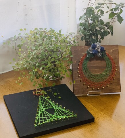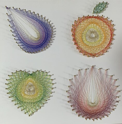 釘を打った板に糸をかけてアート作品を作ります。数時間で簡単に誰にでもできます。カラフルな糸をかけて楽しみましょう!