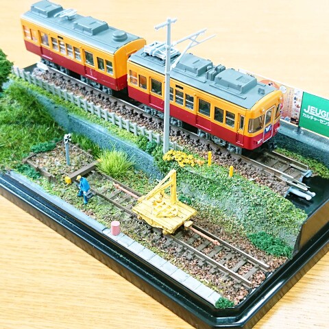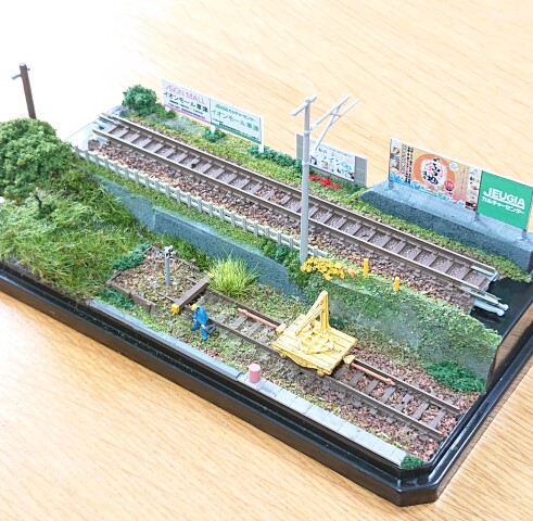 バラストやカラーパウダーを撒いたり、鉄道施設ストラクチャー(架線柱や沿線看板など)や樹木などの小物も設置をして「鉄道ジオラマ」を完成させましょう~♪
