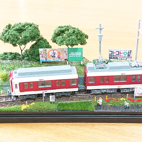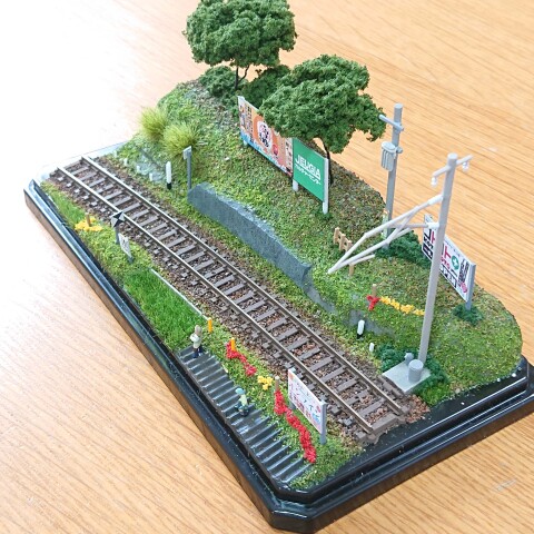 バラストやカラーパウダーを撒いたり、そして鉄道施設ストラクチャー(架線柱や沿線看板など)や樹木、農作業をしている人などの小物も取り付けて「鉄道ジオラマ」を完成させましょう~♪