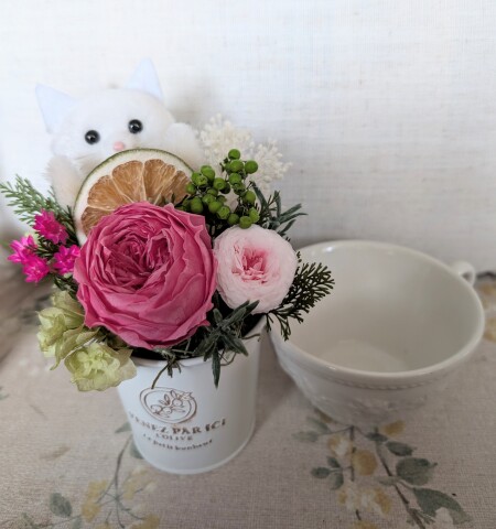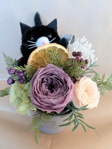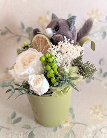 プリザーブドフラワーやドライフラワー、アーティフィシャルグリーンの間からひょっこり顔を出す可愛いネコちゃん♪
