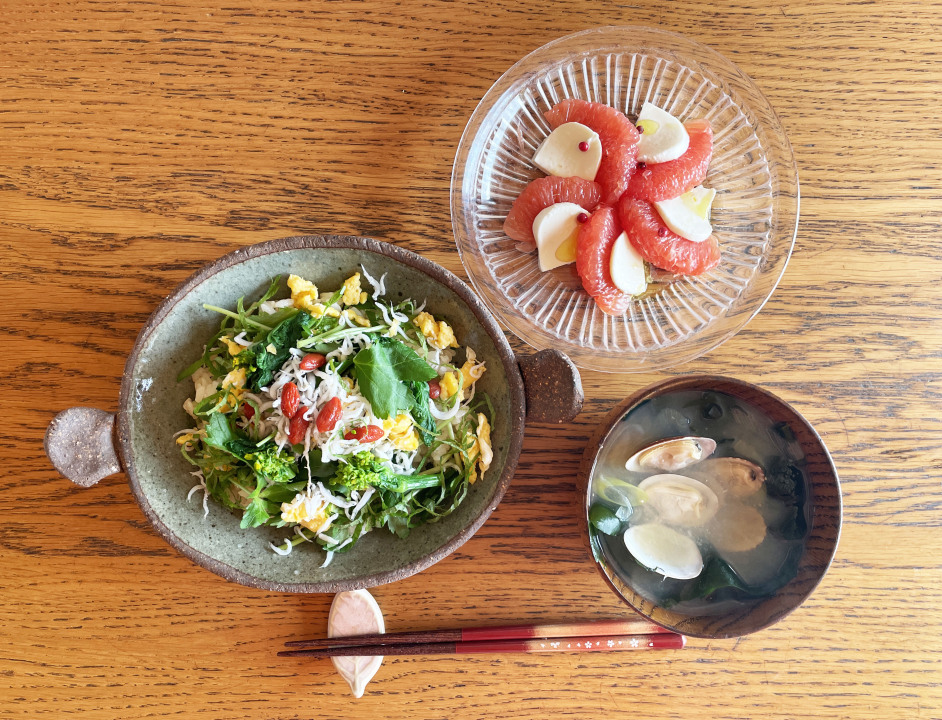 メニュー:菜の花と香り菜のちらし寿司、あさりとわかめの味噌汁、グレープフルーツのカプレーゼ