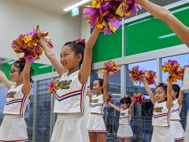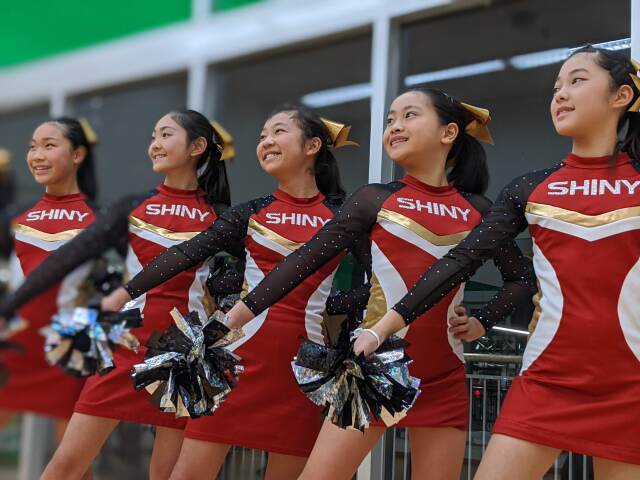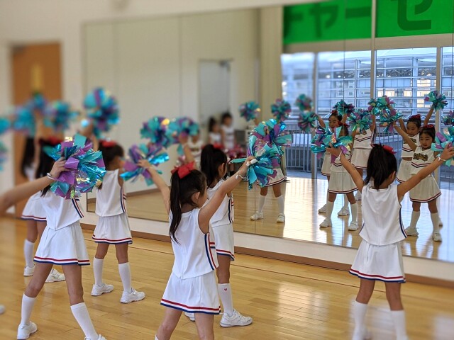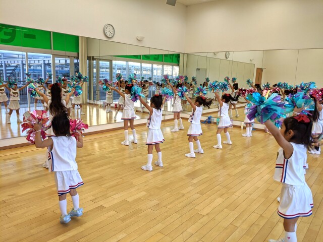 人を励まし、感謝する気持ちを育みます。柔軟体操から始まり、チアの基礎、アームモーション、キックターン、ステップなどの練習の後振り付け!