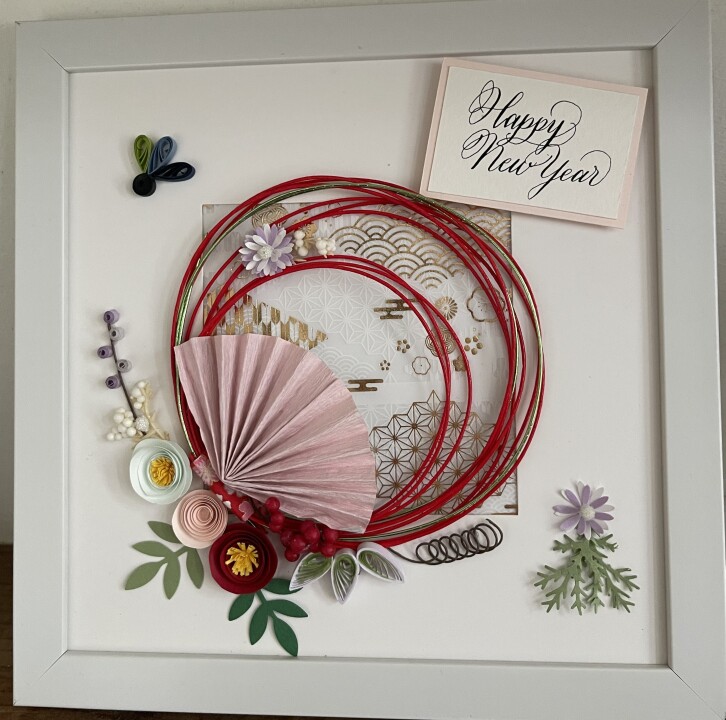 ペーパークイリング、ペーパークラフトの技法でお正月モチーフやお花をつくり、水引きなどと組み合わせ、毎年飾って楽しめる写真立て仕立てのお正月フレームを制作します。水引きの色や中身の和紙などはお好みのものを選んでいただけます。