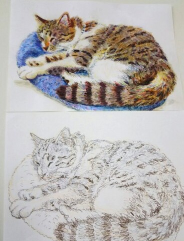 色鉛筆を使い、やさしい色の重ね方や表情のつけ方など、
