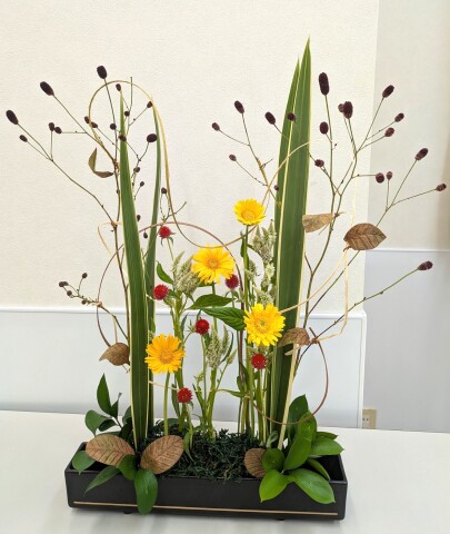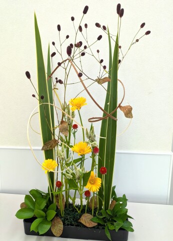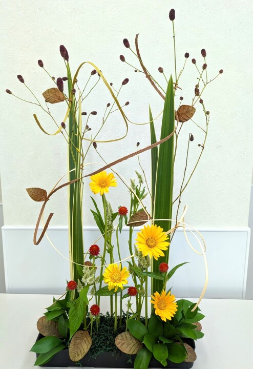 秋を感じさせる草花の中に、ワイヤーで自然と風を感じさせる生け方がポイントです