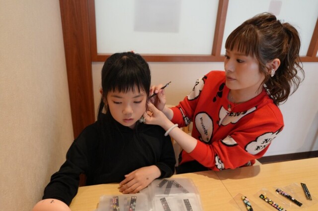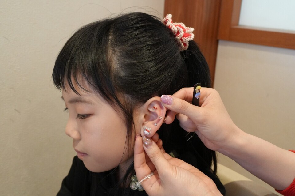 キラキラして可愛い耳ジュエリーシールを、耳つぼ講師が子供さんの耳に貼り付けます♪