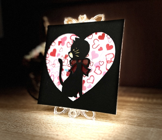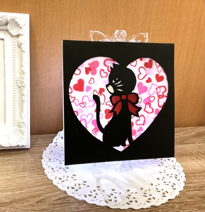 黒の画用紙をデザインカッターで切り抜き、色とりどりのフィルムを貼っておしゃれなネコさんに仕上げます。