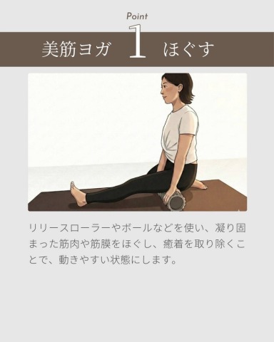 まず、初めにリリースローラーやボールなどを使い、凝り固まった筋肉や筋膜をほぐして、癒着をスッキリ取り除いていきます。次にヨガのポーズやストレッチで呼吸とともに、ゆっくり身体を伸ばし筋肉の柔軟性を上げます。最後にボディメイクや不調改善に、大切な筋肉を使って鍛えます。