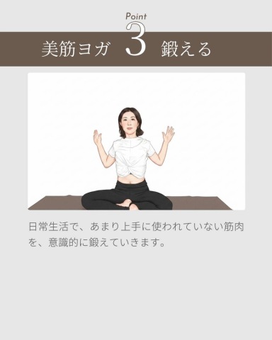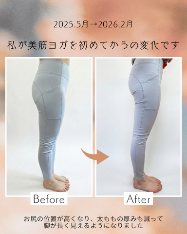 「毎日、自分の身体と向き合う時間を作って欲しい」私はそのように思っています。替えの効かない自分の身体。心も体も大切にして欲しい。私は不調改善のためにヨガを始めましたが、ボディメイク要素の入っている美筋ヨガと出会い、自分の気になっていた部分が改善されていき、美筋ヨガをすることが楽しくなりました。毎日3ステップ全てを行えたわけではありませんが、1日数分でも身体と向き合い、動かしていくことで、だんだんと体は変わり始め、血液の循環もよくなり、不調も改善されて、それが嬉しくてたまりませんでした。このように嬉しい気持ちになれる人が増えてほしいと思っています。自分の好きなことを続けられる身体でいれるようにサポート致します。