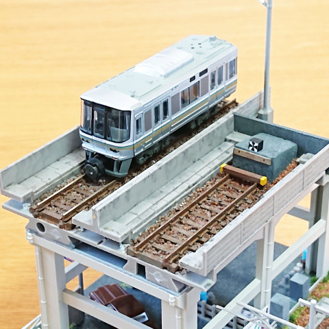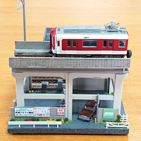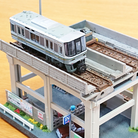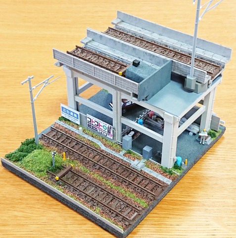 土台に高架橋を取付けて、また地上線の線路回りにはバラストやカラーパウダーを撒いたり、そして鉄道施設ストラクチャー(架線柱や沿線看板など)などの小物も取り付けて、立体的で都市部のような「鉄道ジオラマ」を完成させましょう~♪