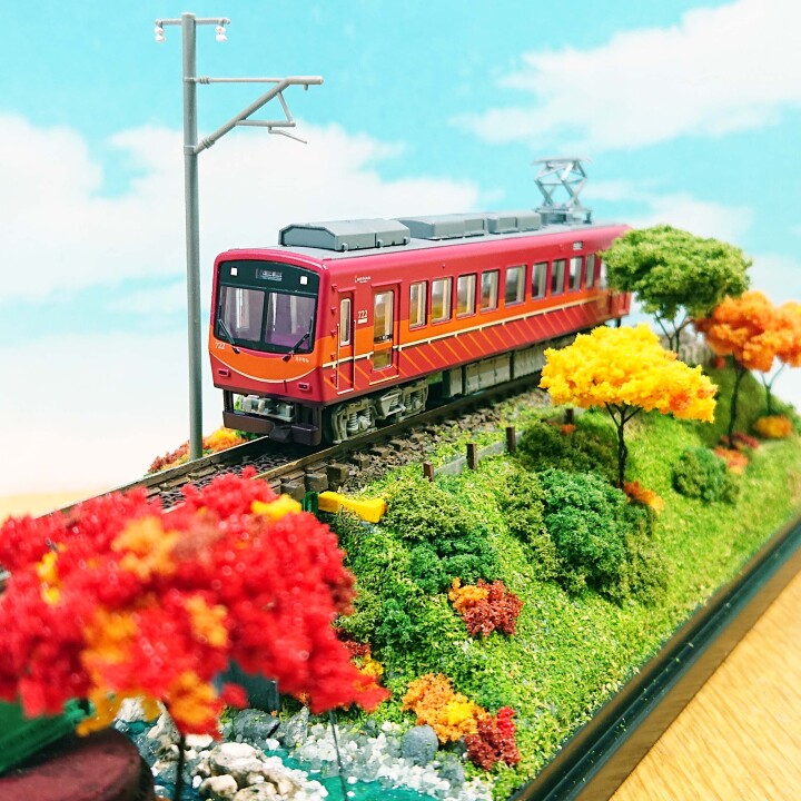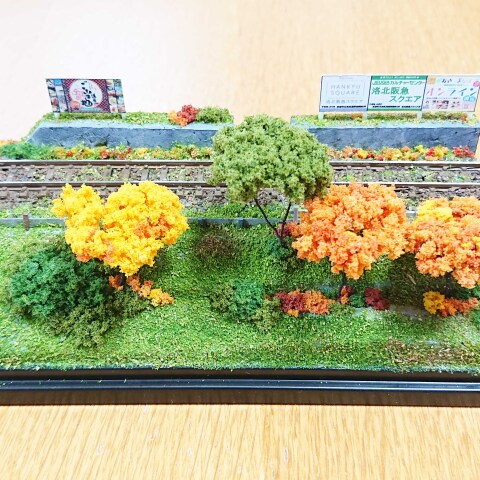 バラストやカラーパウダーを撒いたり、鉄道施設ストラクチャー(架線柱や沿線看板など)を取り付けて、また紅葉の木も作って「鉄道ジオラマ」を完成させましょう~♪