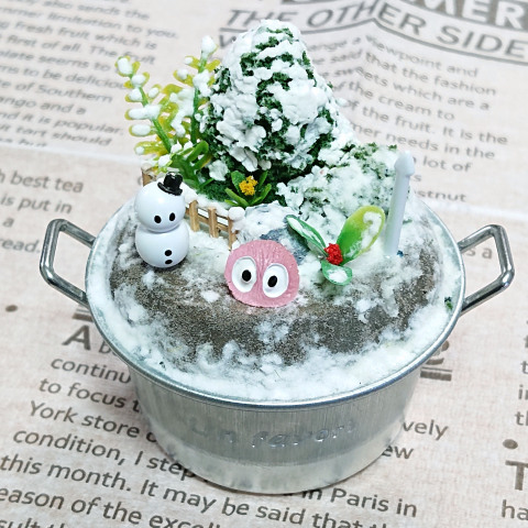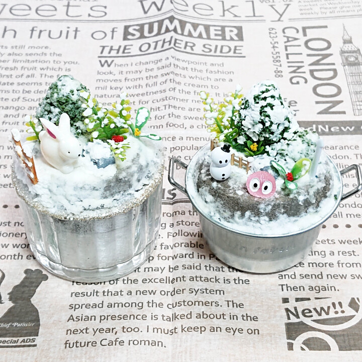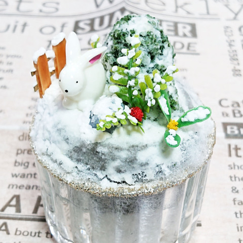 雪をかぶったモコモコした木々や草花を作ったり、また雪だるまやウサギなどのフィギュアも取り付けて、おとぎ話に出てくるような幻想的で可愛らしい「手のひらサイズの雪景色ジオラマリウム」を完成させましょう~♪